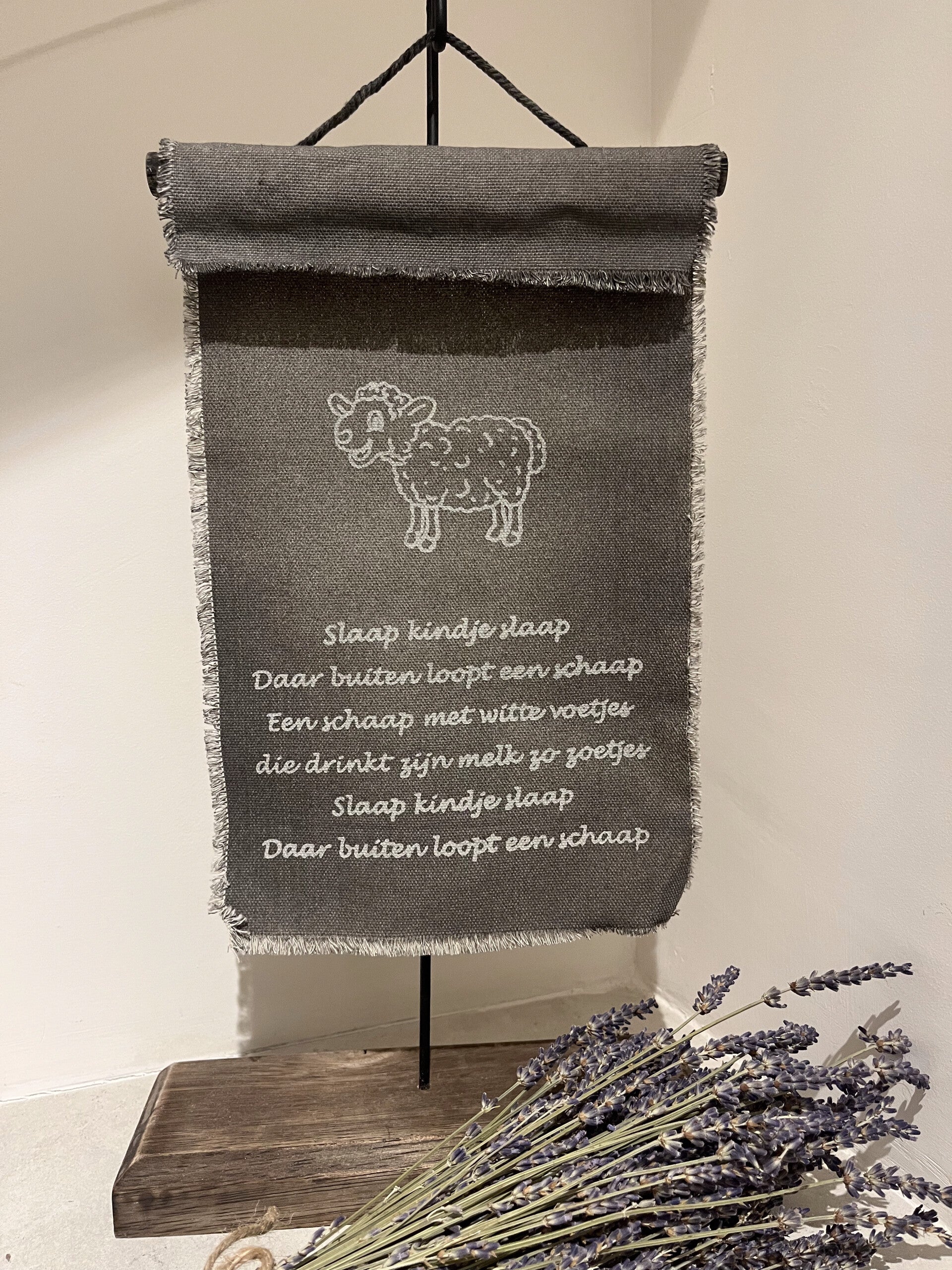 Doek met tekst "Slaap kindje slaap. Daar buiten loopt een schaap. Een schaap met witte voetjes die drinkt zijn melk zo zoetjes, slaap kindje slaap. Daar buiten loopt een schaap"