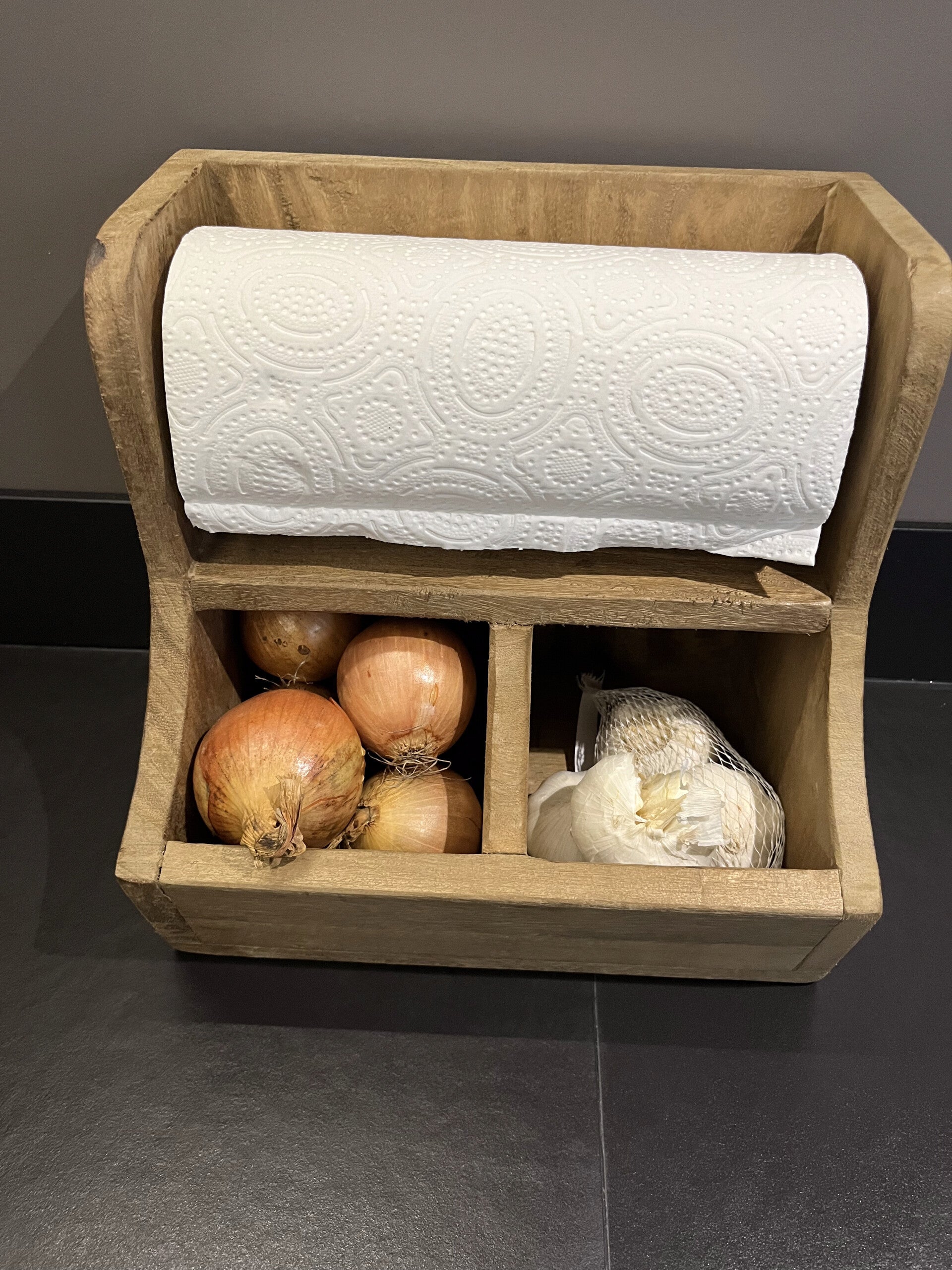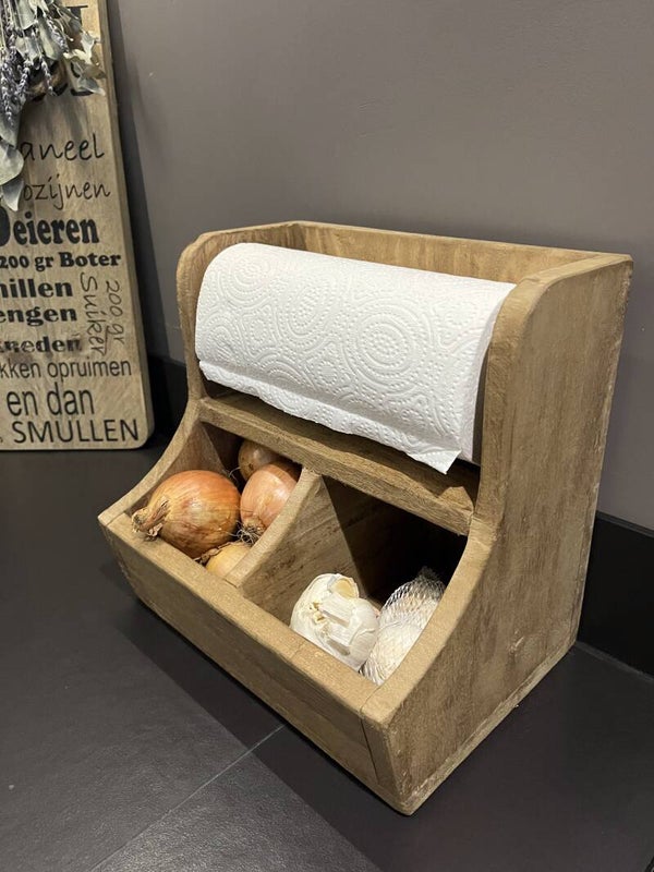Prachtige keukenrolhouder/gruttersbak met 2 vakken, past perfect in een landelijk interieur.