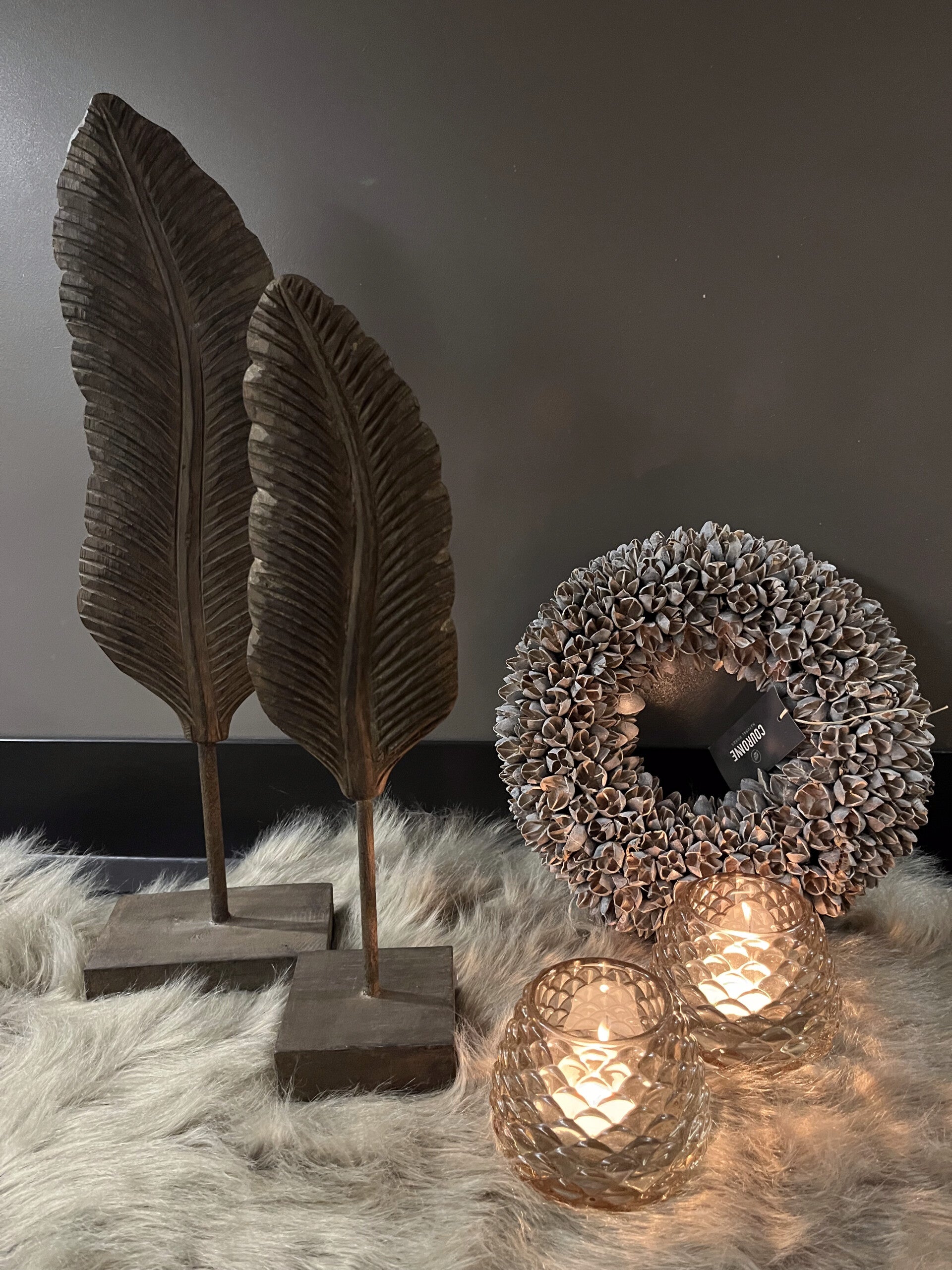Prachtig veren/bladen ornament op voet. Op vele manieren te decoreren, ook leuk voor op de vensterbank.